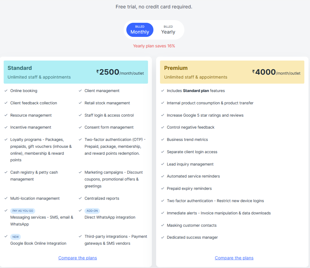 MioSalon offers two flexible pricing plans to meet the needs of growing salon and spa businesses: Standard and Premium. Both plans are priced per outlet and provide comprehensive features to streamline your daily operations and boost your revenue.