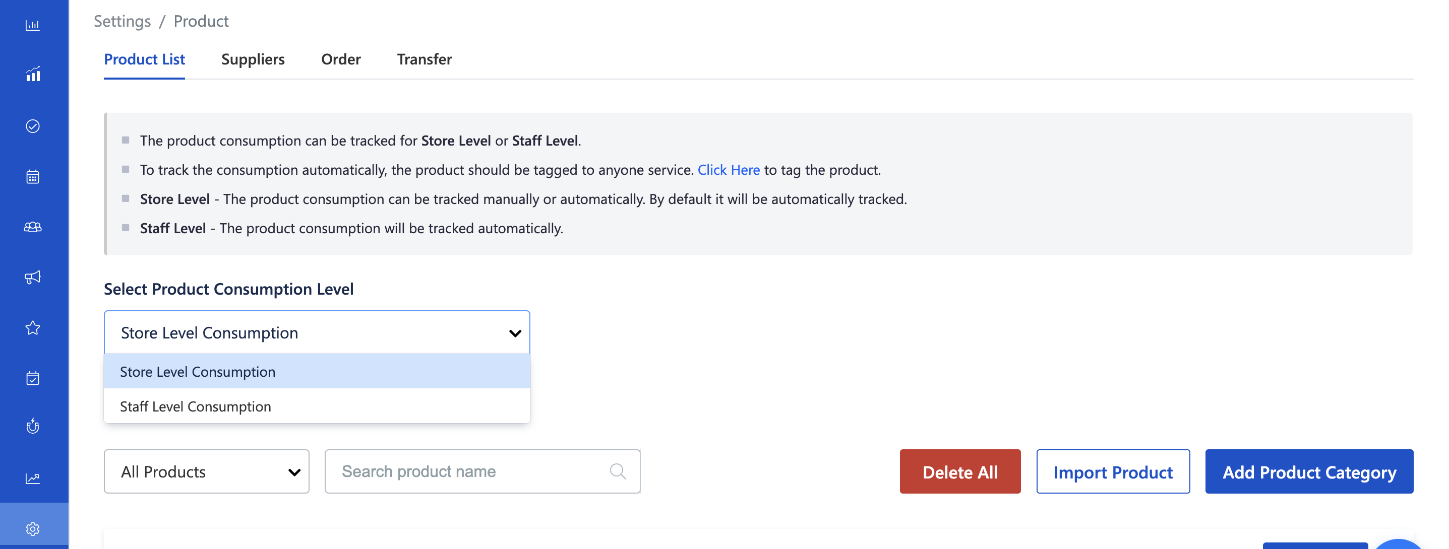 Switch between Store Level and Staff Level consumption tracking.Faster product management