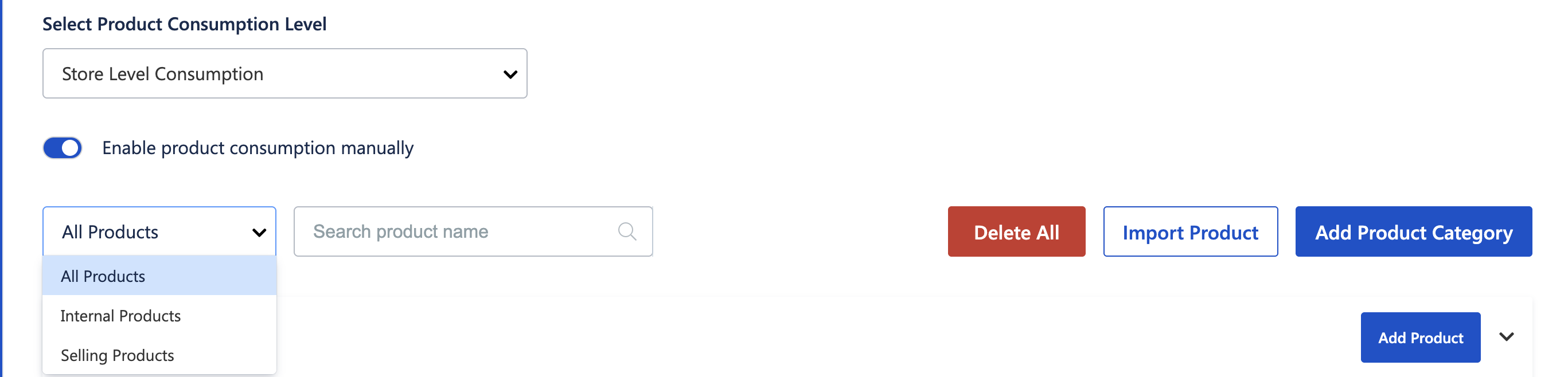 If Store Level is selected, you can optionally enable Enable product consumption manually.