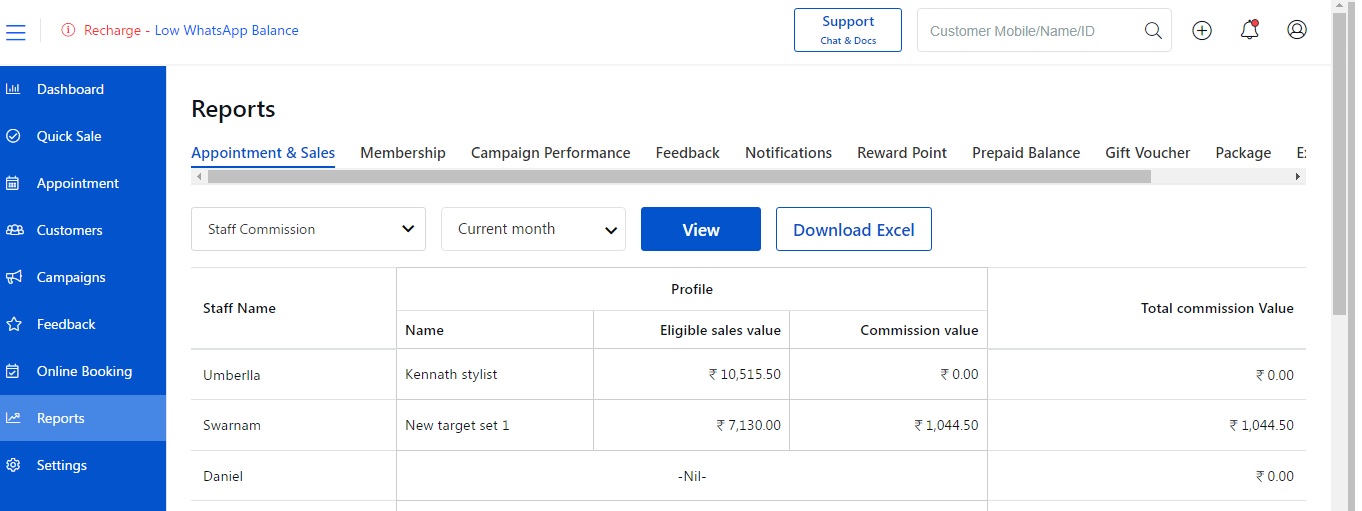A commission report page enables staff to track the amount earned when they reach their targets. It provides a detailed overview of the commission earned by each staff member on a monthly basis. This report helps staff keep track of their individual performance and earnings, allowing them to monitor their progress towards their targets and assess their overall performance.
