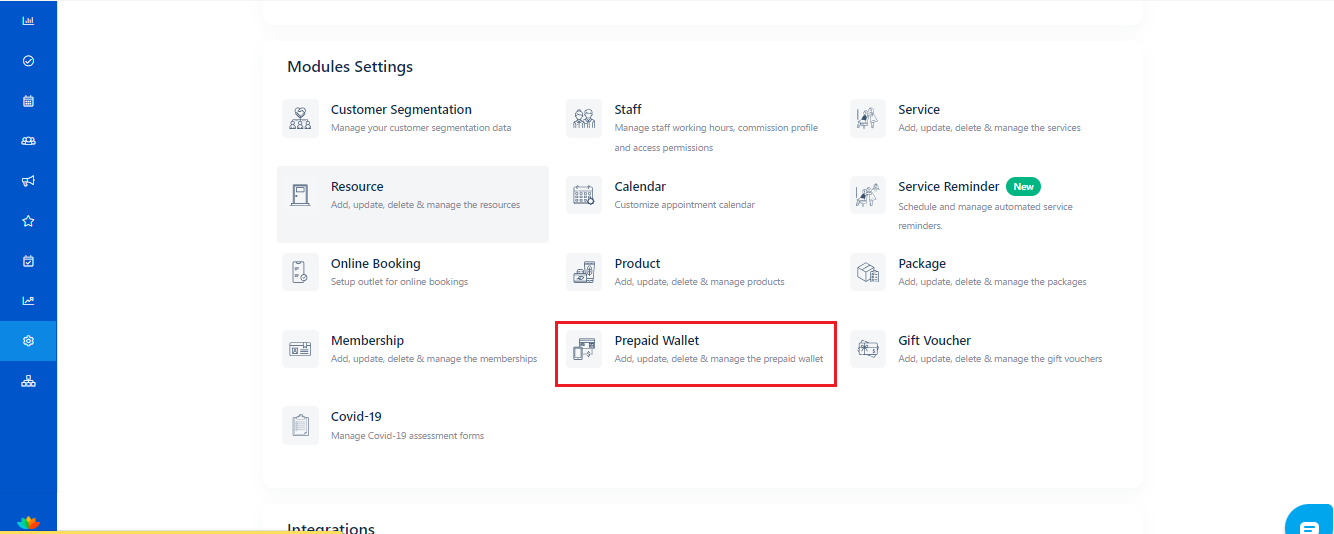 Scroll down to “Modules Settings”. Click on “Prepaid Wallet”.