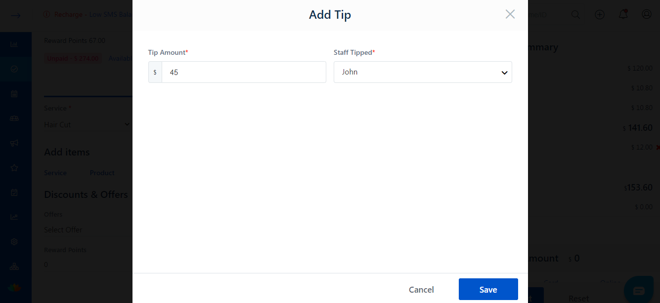 Tip Amount: Specify the amount the client intends to give as a tip to the staff.