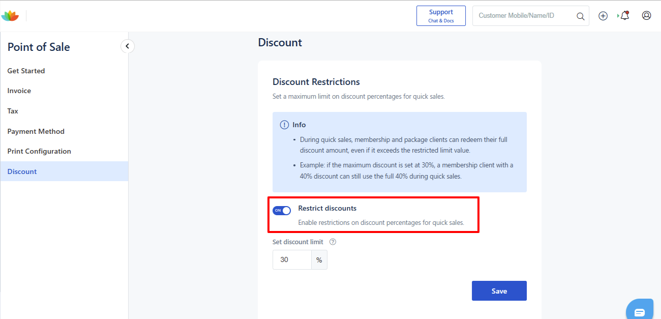 In the Set Discount Limit, enter the maximum discount percentage that can be applied during checkout in the quick sale.