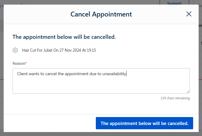 1. The Cancel Appointment popup displays and enters the Reason for cancellation.
