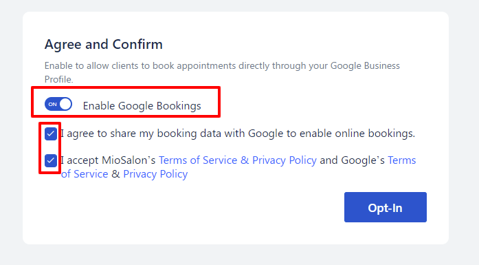 Under Agree and Confirm, Enable Google Bookings and check the boxes to indicate that you agree to the Terms of Service and Privacy Policy of both MioSalon and Google.